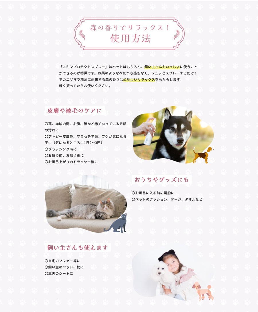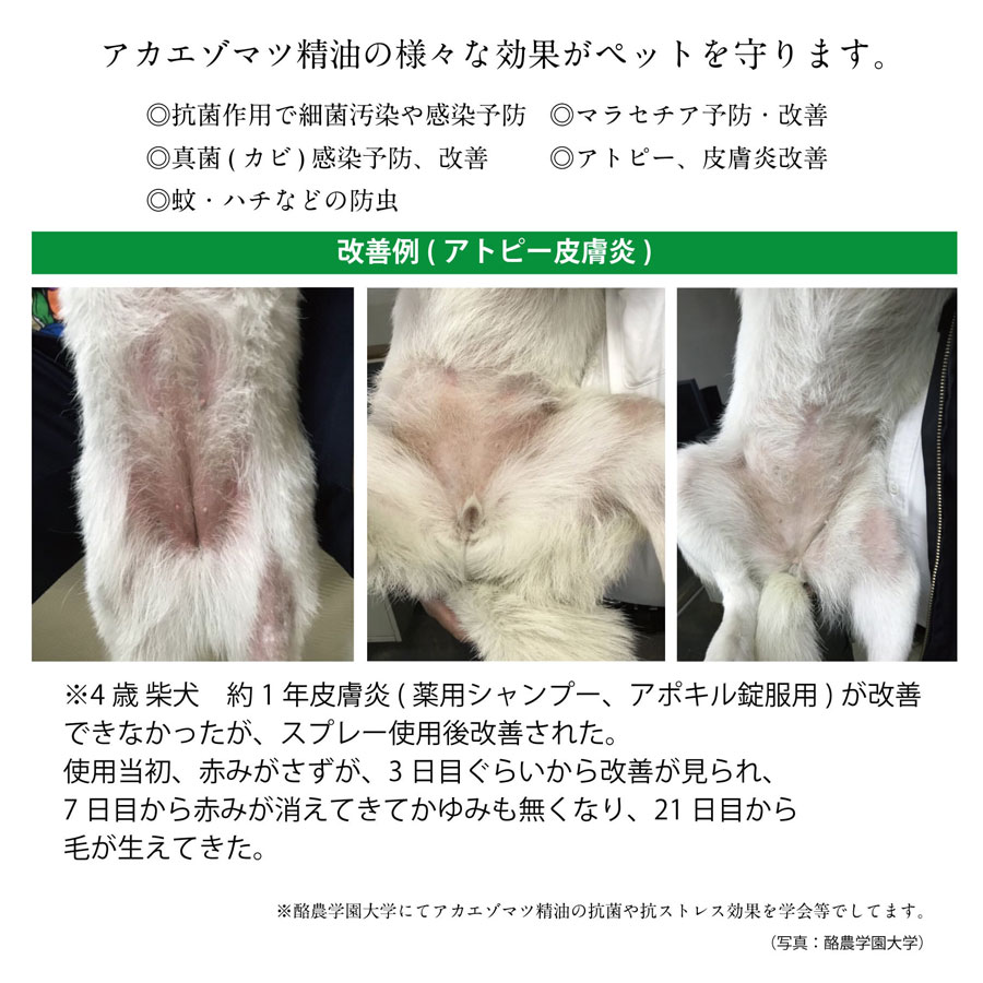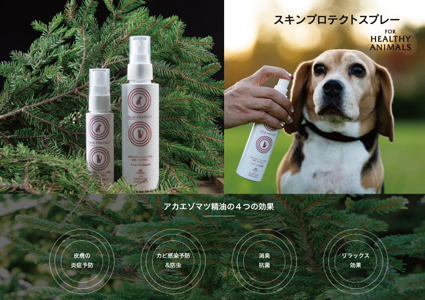 ペットの皮膚に対して炎症の予防や改善のほか、細菌やカビの感染、防虫によるウイルス感染を防ぐ症例が発表されております。。さらにアカエゾマツ精油の爽やかな香りで、消臭やリラックス効果の高い、ヒーリングスプレーです。