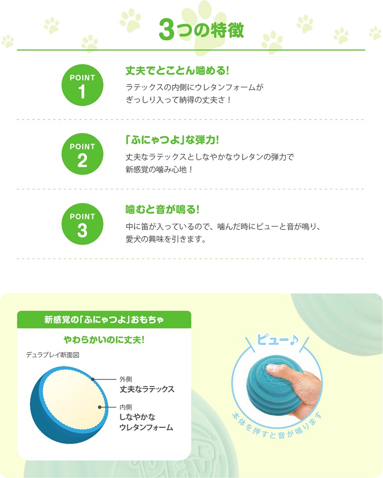 【使用上の注意】 ・犬用おもちゃ以外の用途には使用しないでください。 ・火気の近くで使用しないで下さい。 ・誤食を避けるため、飼い主様の目の届くところで遊ばせてください。 ・遊び終えましたら、お子様やペットが触れない場所に保管してください。 ・万一おもちゃの一部を飲み込んでしまっても、ほとんどの場合便と一緒に排せつされますが、 異常を感じる場合には獣医師にご相談下さい。 ・壊れたら新しいおもちゃとお取替え下さい。 ・笛部分を集中して噛むと、笛が壊れてしまい音が鳴らなくなることがあります。 ・汚れたら、硬く絞った布などで拭いてください。 ・熱湯消毒や、シンナー、ベンジン、アルコールなどの使用はおやめ下さい。 ・明るい場所に長時間置いておくと色あせることがあります。 ・香りの感じ方には個人差があります。 愛犬には十分感知できる量の香料を使用しています。