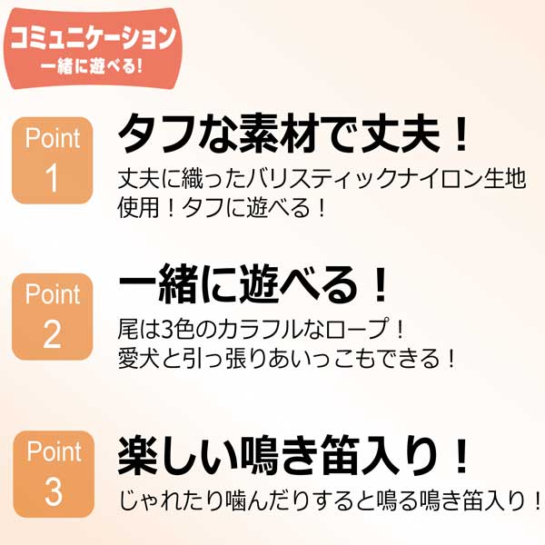 丈夫に織ったバリスティックナイロン生地を使用!タフに遊べる!尾は3色のカラフルなロープ!