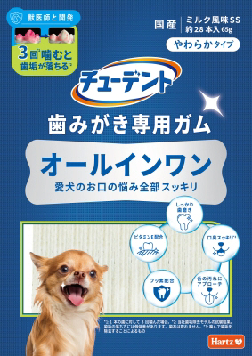 噛む力が弱い愛犬やシニア犬でもご使用いただけるやわらかタイプ ・3回噛むとしっかり歯垢を落とす。※1※2 ・歯垢を除去して口臭スッキリ。※3 ・舌の汚れにアプローチ。 ・歯の健康をサポートするフッ素配合。 ・歯ぐきをケアするビタミンE配合。 ※1:1本の歯に対して3回噛んだ場合。 ※2:歯垢の落ち方には個体差があります。歯石は取れません。 ※3:噛んで歯垢を除去することによるもの。 こんな愛犬におすすめ ●SS:~3kg ●S-M:3~12kg