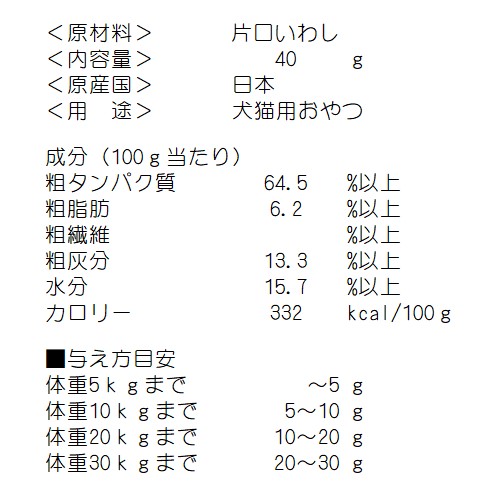 瀬戸内海で水揚げされた小イワシを新鮮な内に無塩加工しました。新鮮なので変色や臭みもなく、美味しくきれいな色のいわしはみんなの大好物。他の煮干しを食べなかった子にもおススメです。ヘルシーなご褒美やおやつ、よく噛んでストレス解消に最適です。≪ご注意≫・年齢、体重、健康状態によって調節してお与えください。・喉に詰まらせないよう注意してください。・飼い主様の目の届く範囲でお与えください。・開封後はなるべく早めにお与えください。