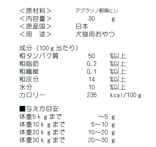 気仙沼で水揚げされた新鮮なさめをすばやく加工新鮮なので変色や臭みもありません。サメ肉は低カロリー、低脂肪、高タンパク質、低アレルギー。ふかひれの豊富なコラーゲンの他、さめ肉にはプロテオグリカン、コンドロイチン、グロコサミン、カルシウムなど豊富な栄養で皮膚、被毛、関節の健康をサポートします。≪ご注意≫・年齢、体重、健康状態によって調節してお与えください。・喉に詰まらせないよう注意してください。・飼い主様の目の届く範囲でお与えください。・開封後はなるべく早めにお与えください。