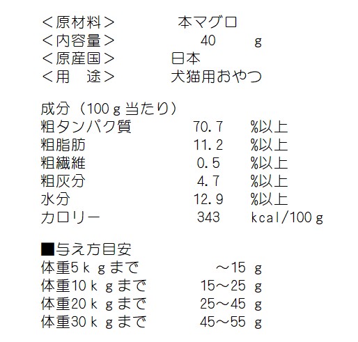 どんなわんちゃんねこちゃんにも大好きな国産マグロです。タンパク質やオメガ3系脂肪酸であるDHA・EPA、ナイアシン、ビタミンD,鉄、ビタミンEなど豊富に含みます。血合いにはねこちゃんの必須アミノ酸であるタウリンが豊富に含まれています。ヘルシーなご褒美やおやつ、よく噛んでストレス解消にも最適です。≪ご注意≫・年齢、体重、健康状態によって調節してお与えください。・喉に詰まらせないよう注意してください。・飼い主様の目の届く範囲でお与えください。・開封後はなるべく早めにお与えください。