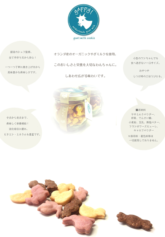 ■商品特長オランダ産のオーガニックヤギミルク使用。銀座のシェフ監修のもと、一つ一つ丁寧に手作りで仕上げました。消化吸収に優れ、ビタミン・ミネラルが豊富なので、子犬から老犬までおいしく栄養補給ができます。小型犬のワンちゃんでも食べ過ぎない一口サイズなので、おやつやトレーニングご褒美にもぴったりです。お部屋に置いておいても違和感のないかわいい小瓶に入れてみました。