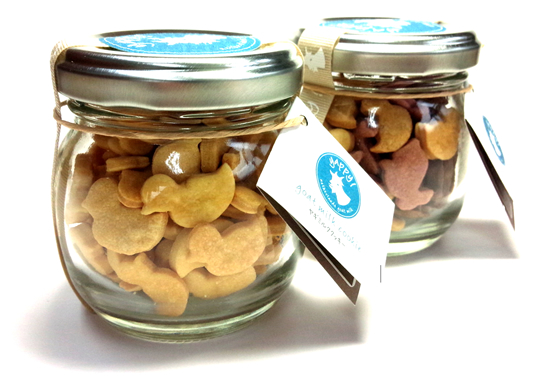 小型犬のワンちゃんでも食べ過ぎない一口サイズなので、おやつやトレーニングご褒美にもぴったりです。お部屋に置いておいても違和感のないかわいい小瓶に入れてみました。