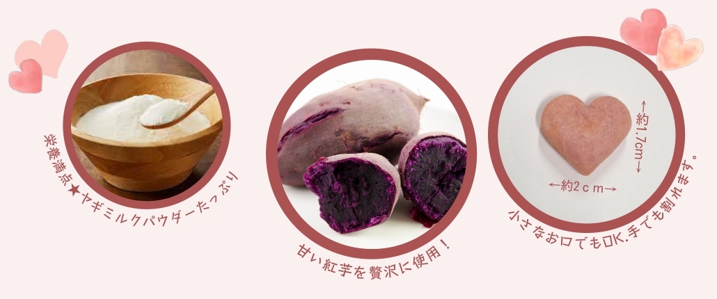 芋が大好きなワンちゃん、ネコちゃんにオススメ! 甘い紅芋を贅沢に使用した、ハート型ホームメイドクッキーです。 ひとつひとつ丁寧に型を抜き、オーブンで焼き上げました。 小さなワンちゃんでも食べ過ぎない一口サイズで、ご褒美やトレーニングに最適。 また、ヤギミルクの中でも「栄養価・品質・美味しさ」を兼ね備えた、ヒューマングレードのオランダ産最高級ヤギミルクを使用。 もちろん、その他の原材料や製造工程も、安心・安全にこだわり、着色料・香料・保存料など無添加です。 美味しさと栄養の料率を目指した自慢のレシピは、どんなグルメなワンちゃんも虜にしてしまいます。