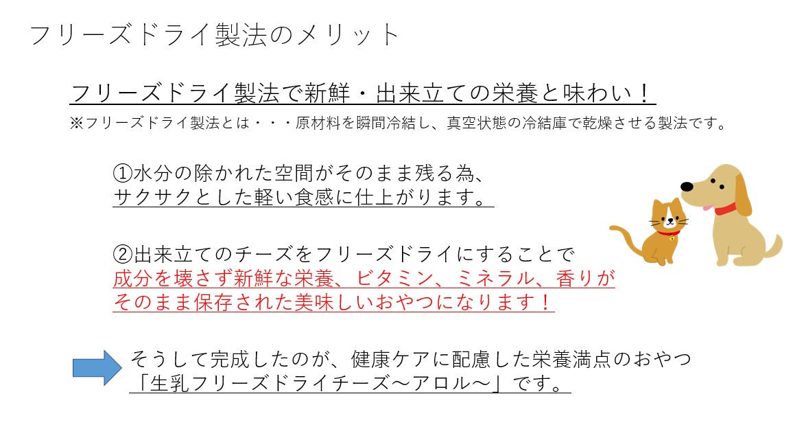 出来立てのチーズをフリーズドライにすることで成分を壊さず、新鮮な栄養、ビタミン、ミネラル、香りがそのまま保存された美味しいおやつです。
