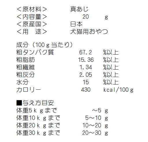 国産の新鮮な豆あじを乾燥加工しました。新鮮なので変色や臭みもなく、美味しい豆あじです。丸ごと食べられるので、ビタミン、ミネラル、カルシウムや必須アミノ酸10種全て摂れます。ヘルシーなご褒美やおやつ、ごはんのトッピングにも最適です。≪ご注意≫・年齢、体重、健康状態によって調節してお与えください。・喉に詰まらせないよう注意してください。・飼い主様の目の届く範囲でお与えください。・開封後はなるべく早めにお与えください。