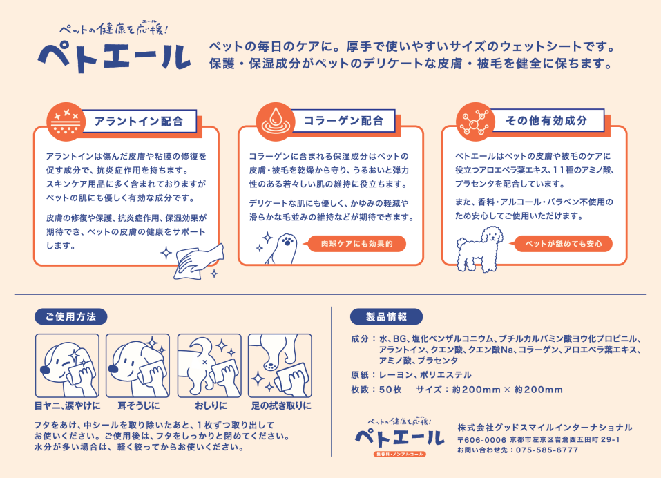 ペットの毎日ケアに!厚手で使いやすいサイズのウェットシートです。