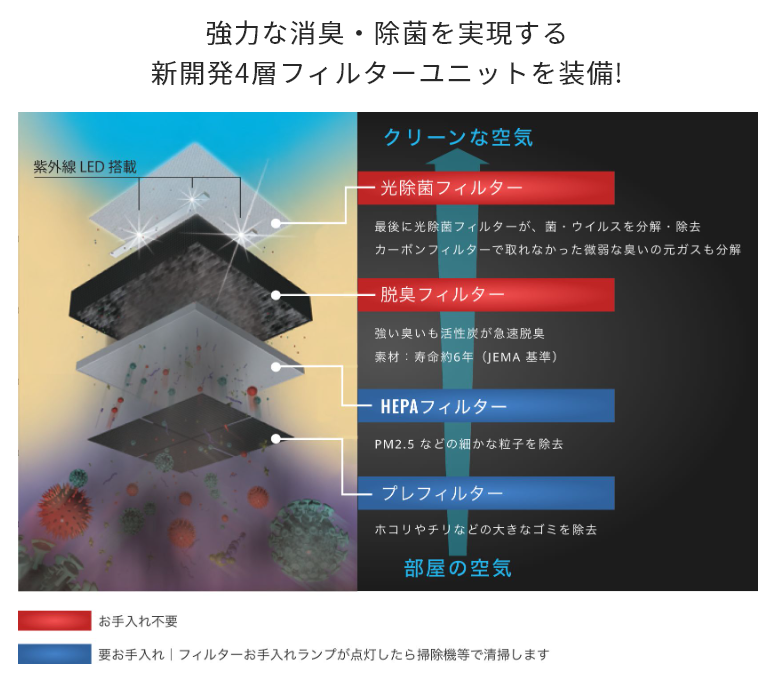 有害因子を本体内部の光除菌フィルター上で分解・除去してキレイな空気でお部屋を満たします。