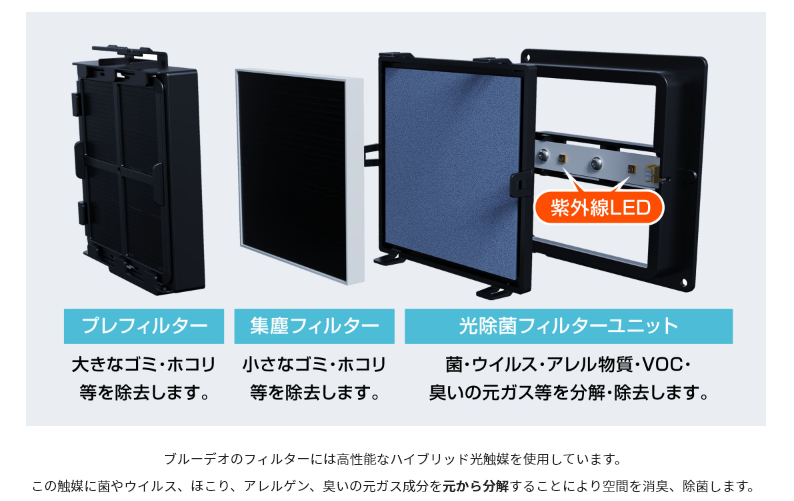 一般的な空気清浄機のフィルターは、菌やウイルス、臭いとなるガス成分を「吸着」させる方式ですが、ブルーディオ(MC-S201)は光除菌フィルターで「元から分解して除去」します。
