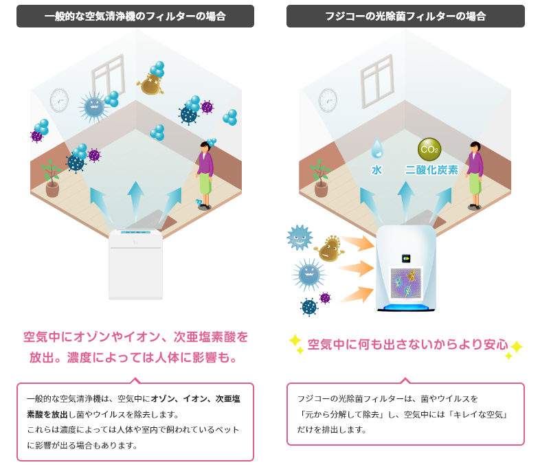 人体の害となる放出は一切なく、内部に空気を取り込んで菌やウィルスを光触媒で分解する方式です。