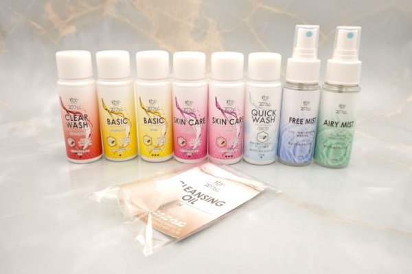クレンジングオイルサンプル(5ml)、クリアウォッシュ(50ml)、ベーシックシャンプー(50ml)、ベーシックリンス(50ml)、スキンケアシャンプー(50ml)、スキンケアリンス(50ml)、クイックウォッシュ原液タイプ(50ml)、フリーミスト(50ml)、エアリーミスト(50ml)