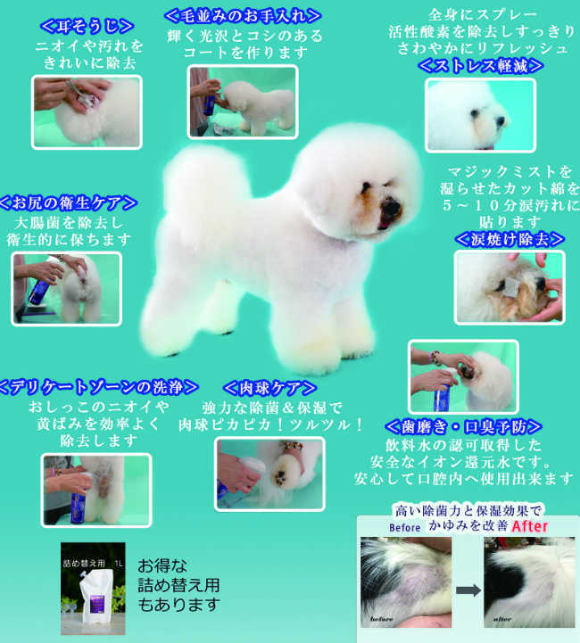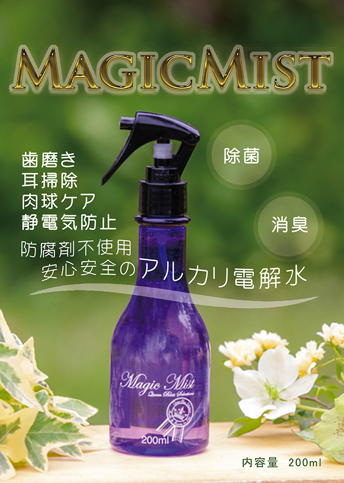 マジックミストは、超純水を特殊な技術で電気処理し電子を持たせた高いアルカリ性をした安心・安全な水です。