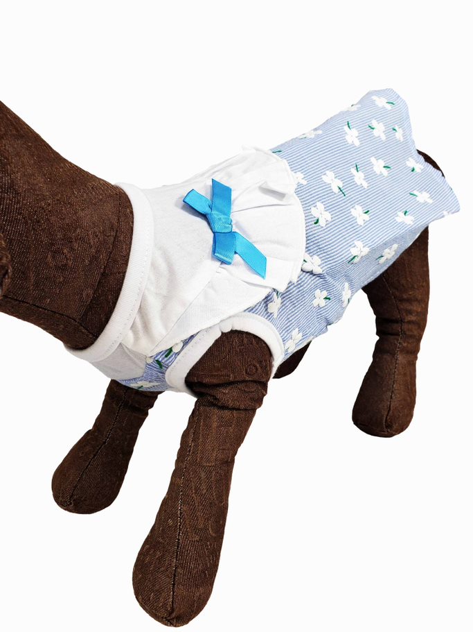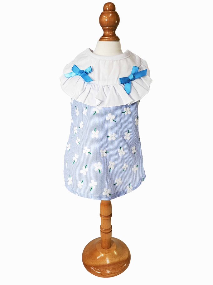 ブラウスやワンピースと短いケープを一体化したようなアイテム。細いストライプに乗った少しぷっくりしたプリントがオシャレ。横がマジックテープ仕様で開きます。