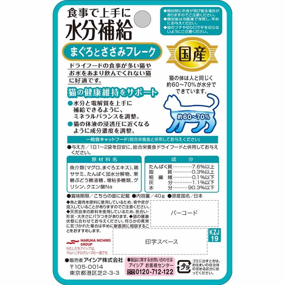 水分と電解質を上手に補給できるように、ミネラルバランスを調整。さらに猫の体液の浸透圧に近くなるように成分濃度を調整し、猫の健康維持をサポート。ドライフードの食事が多い猫や、お水をあまり飲んでくれない猫に好適。フレークタイプ。