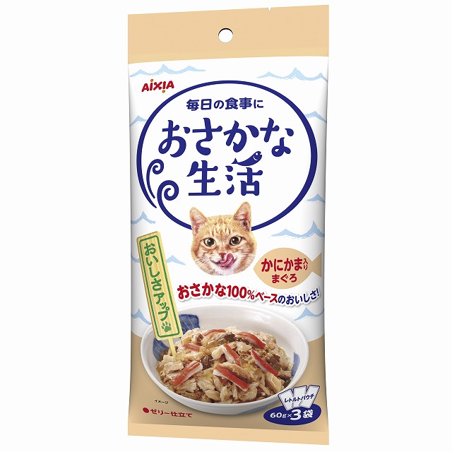 ベース素材はまじりっけなしのおさかな100%。おさかなのおいしさをとじこめたゼリー仕立てで、腸内の善玉菌を増やすオリゴ糖を配合。3袋入り。