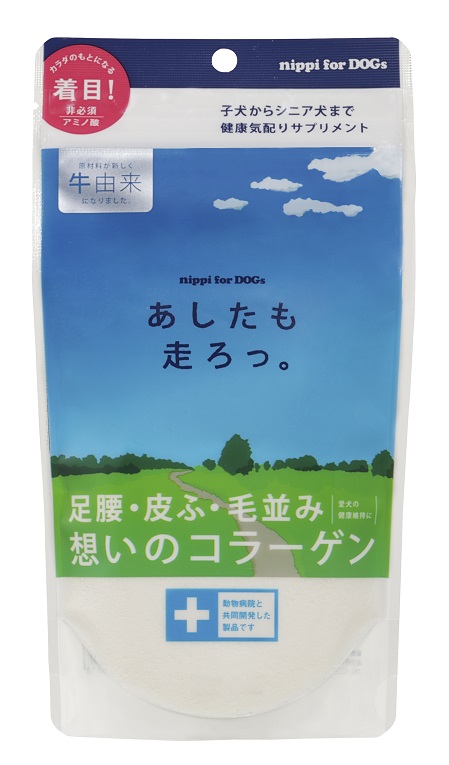コラーゲンは本来、消化のしにくい高分子(分子量30万)ですが、「あしたも走ろっ。」は製造工程において60分の1の分子量5千ぐらいまでに低分子化しているのでスムーズに小腸から吸収できます。折角、ドッグフードの中に非必須アミノ酸で構成されたタンパク質が入っていたとしても、そのタンパク質が高分子のままであった場合、老犬は分解できず吸収できないまま排泄しているかもしれません。「あしたも走ろっ。」にはそんな心配もいりません。