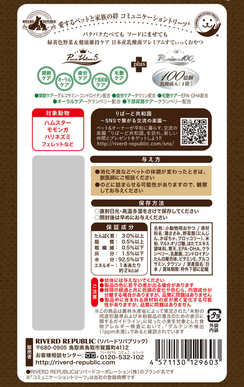 【原材料名】 鶏ささみ、野菜類(にんじん、かぼちゃ、ブロッコリー)、米粉、マルトオリゴ糖、ほたてエキス調味料、寒天、EPA・DHA、クランベリー、乳酸菌、コンドロイチンたん白複合体、ビタミンE、グルコサミン、タウリン