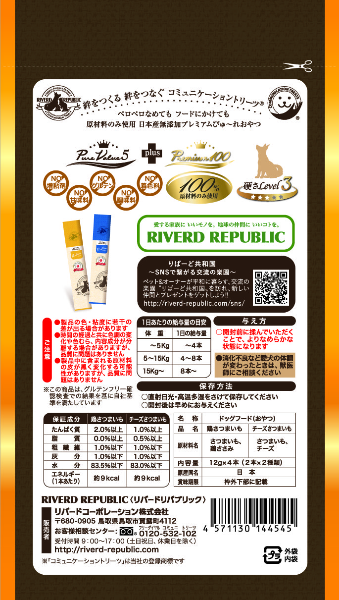 [チーズさつまいも]たんぱく質1.0%以上、脂質0.5%以上、粗繊維1.0%以下、灰分1.0%以下、水分83.0%以下、エネルギー1本あたり約9kcal