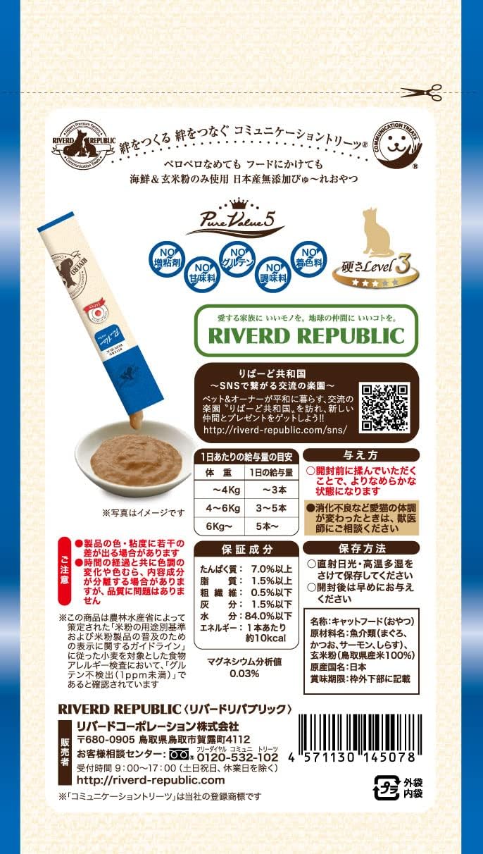 魚介類(まぐろ、かつお、サーモン、しらす)、玄米粉(鳥取県産米100%)