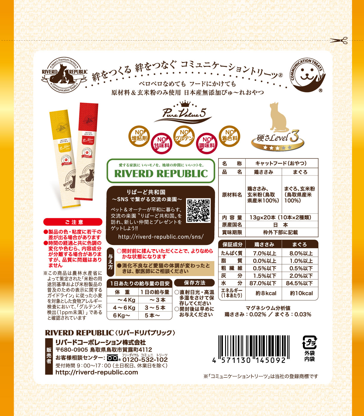 保証成分《まぐろ》たんぱく質8.0%以上、脂質1.0%以上、粗繊維0.5%以下、灰分2.0%以下、水分84.5%以下《鶏ささみ》たんぱく質7.0%以上、脂質0.0%以上、粗繊維0.5%以下、灰分1.5%以下、水分87.0%以下