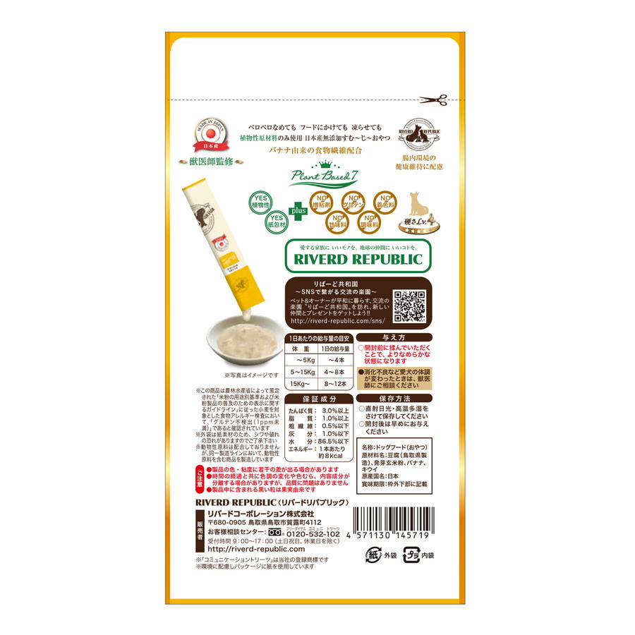 ペロペロなめても、フードにかけても、凍らせても楽しめる、植物性原材料のみ使用の日本産無添加すむ~じ~おやつ。 腸内環境の健康維持に配慮。 鳥取県産厳選豆腐使用。 増粘剤、着色料、グルテン、甘味料、調味料、添加物すべて不使用。 NPO法人ベジプロジェクトジャパンのヴィーガンマーク取得商品*。 * 原材料として動物に由来するもの(肉、魚介類、卵、乳製品、はちみつ等)を含まないことが確認されたものをヴィーガンと定義しています。 獣医師監修。 ※この商品は、農林水産省によって策定された「米粉の用途別基準および米粉製品の普及のための表示に関するガイドライン」に従った小麦を対象とした食物アレルギー検査において、「グルテン不検出(1ppm未満)」であると確認されています。 【注意事項】 ・製品の色・粘度に若干の差が出る場合があります。 ・時間の経過とともに色調の変色や色むら、内容成分が分離する場合がありますが、品質に問題はありません。 ・製品中に含まれる黒い粒は果実由来です。 ・開封前に揉んでいただくことで、よりなめらかな状態になります。 ・消化不良など愛犬の体調が変わったときは、獣医師にご相談ください。 ・直射日光・高温多湿をさけて保存してください。 ・開封後は早めにお与えください。