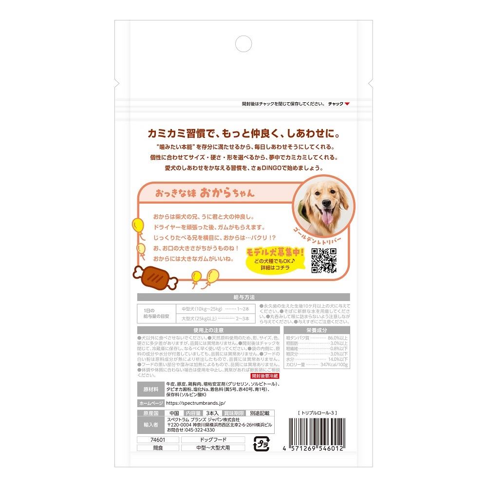 長持ちタイプ! 長く噛むことで歯の汚れを落とします。鶏胸肉・牛皮・豚皮のコンビネーションで、間違いないおいしさ!噛み応え抜群の牛皮、コラーゲンが豊富な豚皮、高プロテイン・低脂肪な鶏むね肉を使用。太めのロールタイプで中・大型犬もしっかり噛める!
