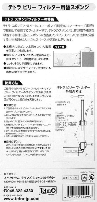 ●テトラ ビリーフィルター専用交換スポンジ●魚を吸い込まないため、稚魚のふ化・育成やグッピーの飼育に適しています。●セット、そうじが簡単にできます。●機能中心のデザインです。色づかいも水槽の中で目立ちません。
