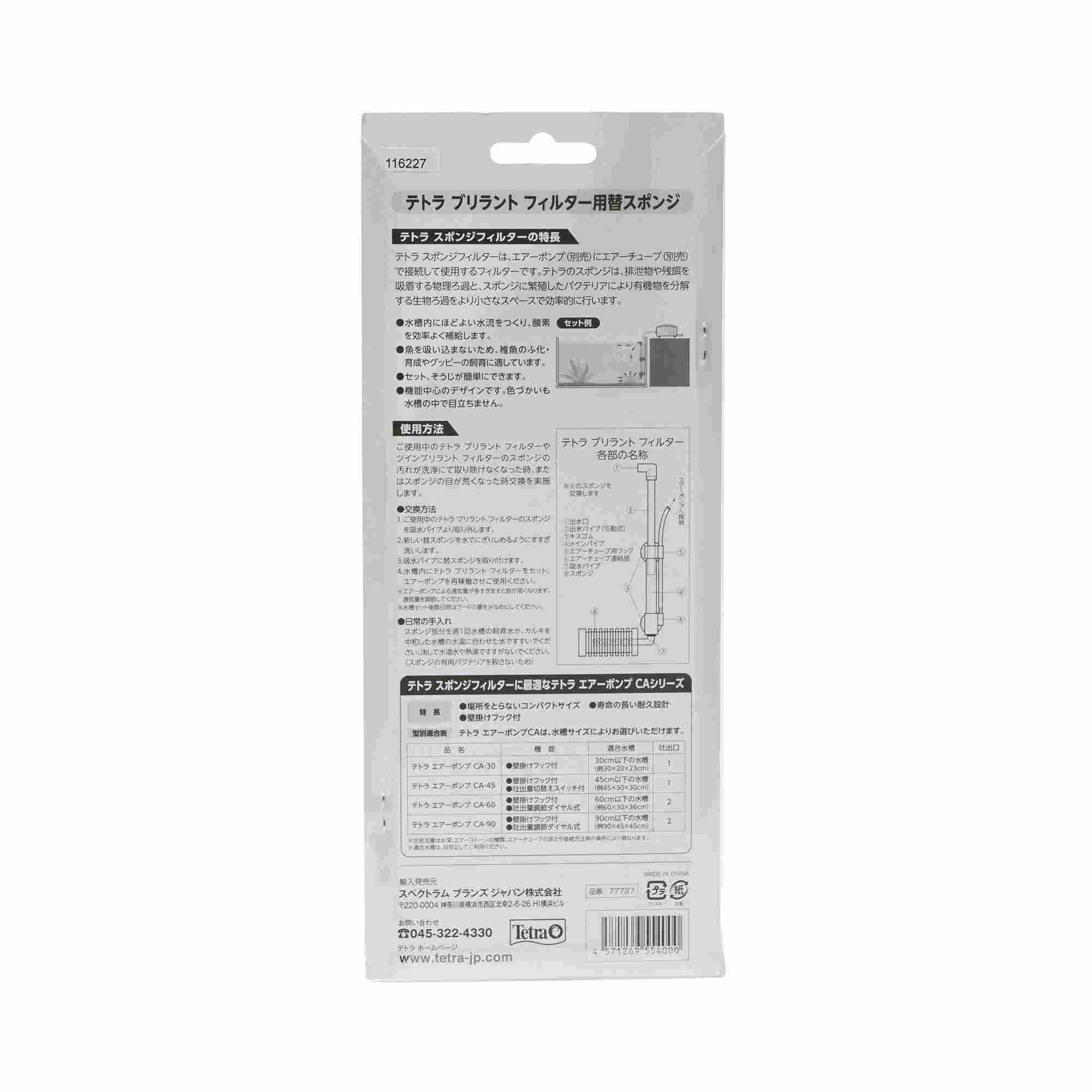 ●テトラ ブリラントフィルター専用交換スポンジ●魚を吸い込まないため、稚魚のふ化・育成やグッピーの飼育に適しています。●セット、そうじが簡単にできます。●機能中心のデザインです。色づかいも水槽の中で目立ちません。