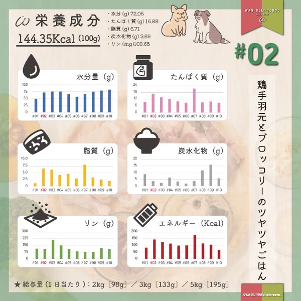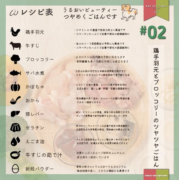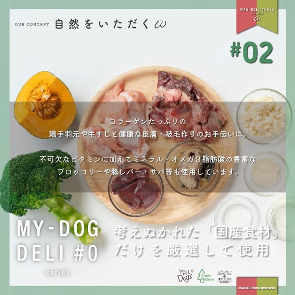 コラーゲンたっぷりの鶏手羽元や牛すじと、健康な皮膚・被毛作りのお手伝いに不可欠なビタミン・ミネラル・オメガ3脂肪酸の豊富なブロッコリーや豚レバー・サバなども使用しています。