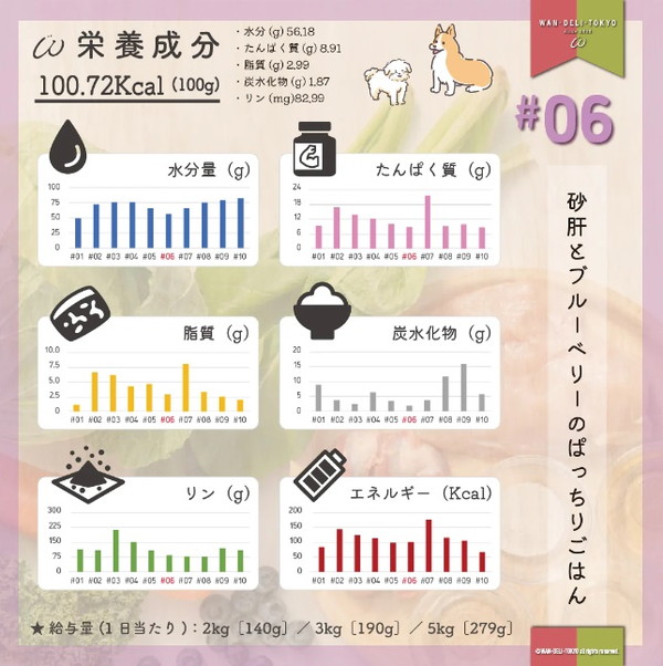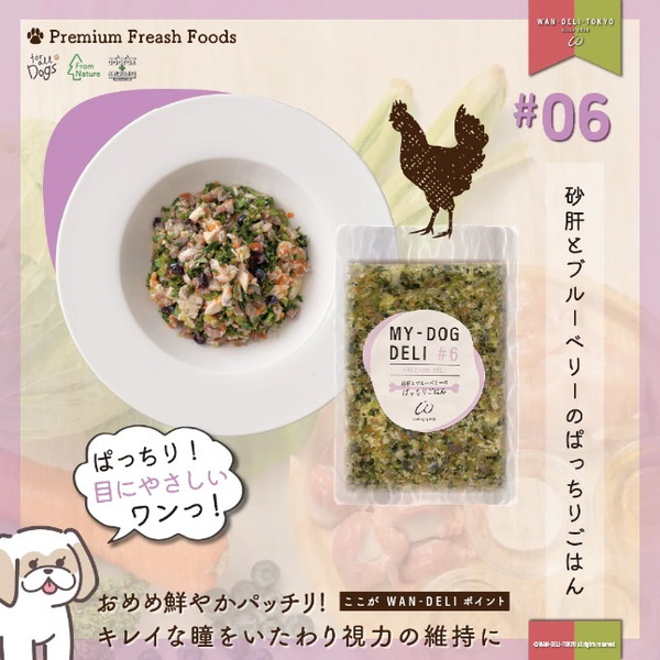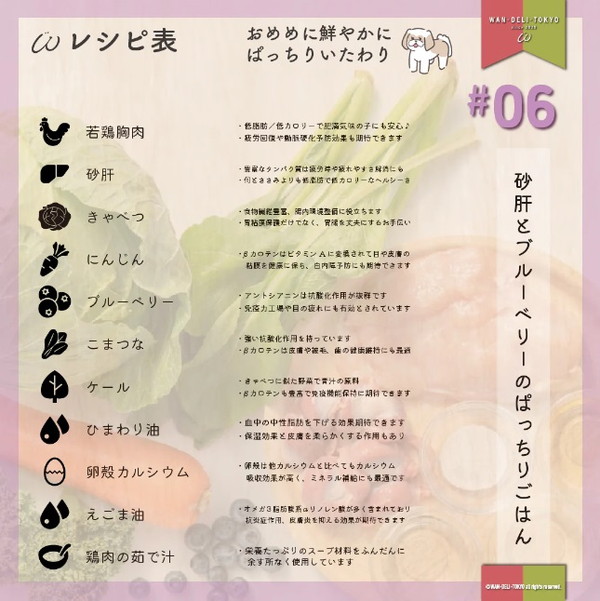 眼にやさしい食材で、きれいな瞳に。 砂肝と鶏むね肉、緑黄色野菜をふんだんに使用し、眼への配慮をしたヘルシーなごはん。 野菜の消化が苦手なわんちゃんにも栄養となるように焼いたり蒸したり茹でたりと、さまざまな方法で調理しました。
