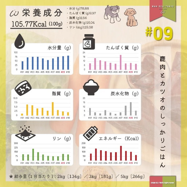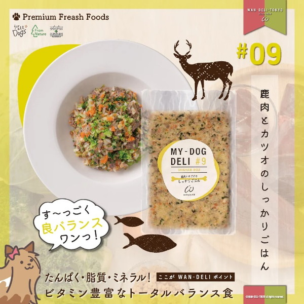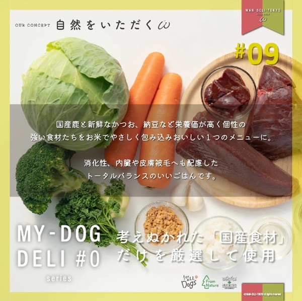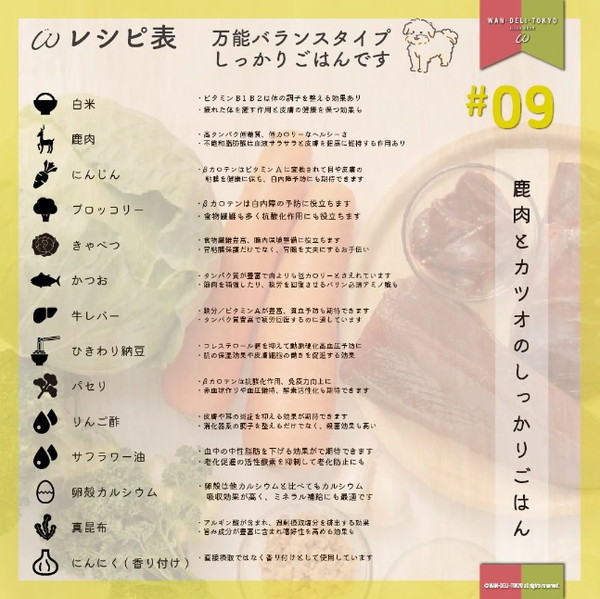 蛋白質・脂質・ビタミン・ミネラル、トータルバランスのいいご飯。 国産鹿と新鮮なかつお、納豆など、栄養価が高く個性の強い食材たちをお米でやさしく包み込み、おいしい1つのメニューにしました。 消化性、内臓や皮膚被毛へも配慮したトータルバランスのいいごはんです。