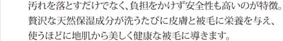 使うほどに地肌から美しく健康な被毛に。化粧品に使われるグレードの原料のみを使用し低刺激でデリケートなペットの皮膚にも、洗う人の手にも優しいシャンプーです。