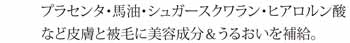プラセンタ・セラミド・ヒアルロン酸・コラーゲン・馬油など天然保湿成分がペットの皮膚と被毛に栄養を補給し、メドウフォーム配合で乾かすだけでふんわり柔らかく美しい仕上がりに。