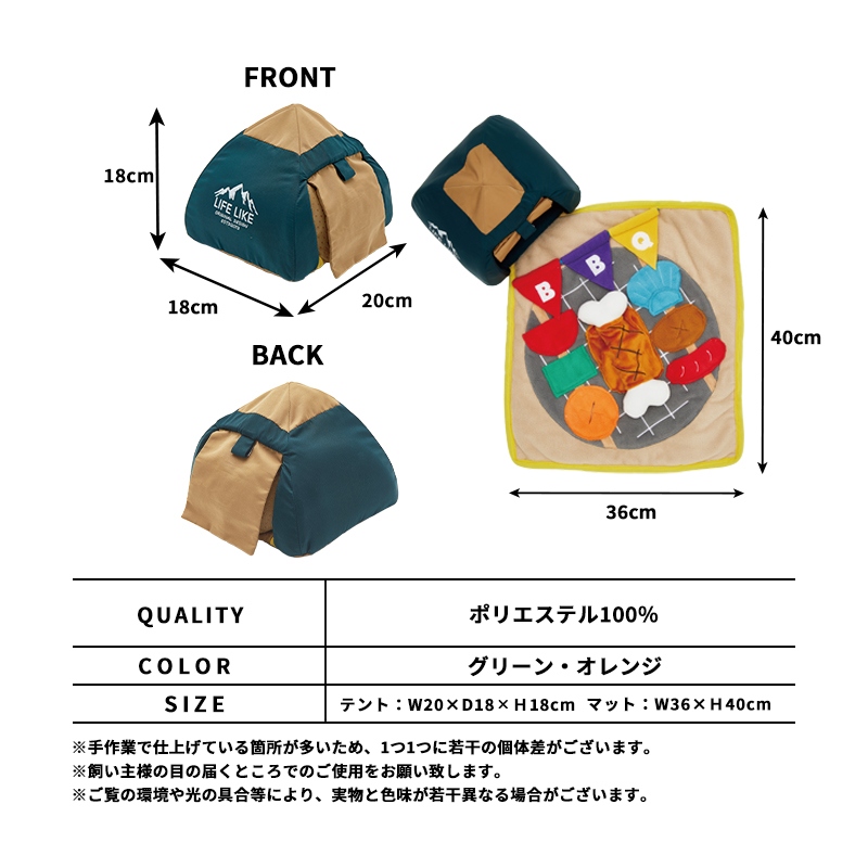 特長 マットには厚手のフェルト素材を使用しています。 中綿が少ないのでお洗濯も可能で、清潔な状態を保つことが出来ます! ※テントが型崩れする恐れがあるので、手洗いでのお洗濯を推奨いたします。 裏面には滑り止め付きです。