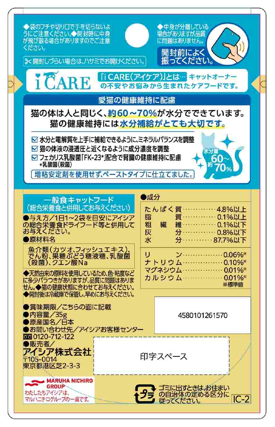 水分と電解質を上手に補給できるように、ミネラルバランスを調整。猫の体液の浸透圧と近くなるように成分濃度を調整。腎臓の健康維持に配慮し、フェカリス乳酸菌「FK-23」を配合。さらに、リンとナトリウムを調整。着色料・発色剤・香料・増粘安定剤不使用。ペーストタイプ。