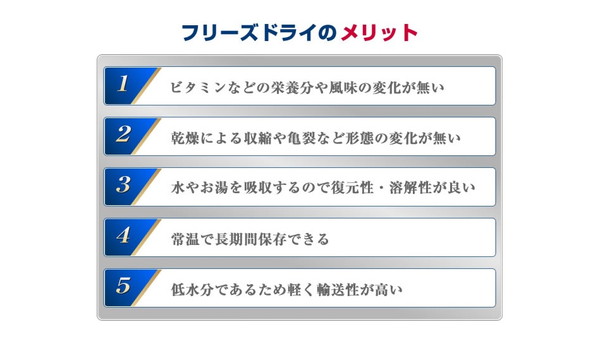 もちろんフレッシュな素材には『何も加えず何も引かず』フリーズドライをしましたので、保存料や着色料などの添加物は一切使用しておりません。