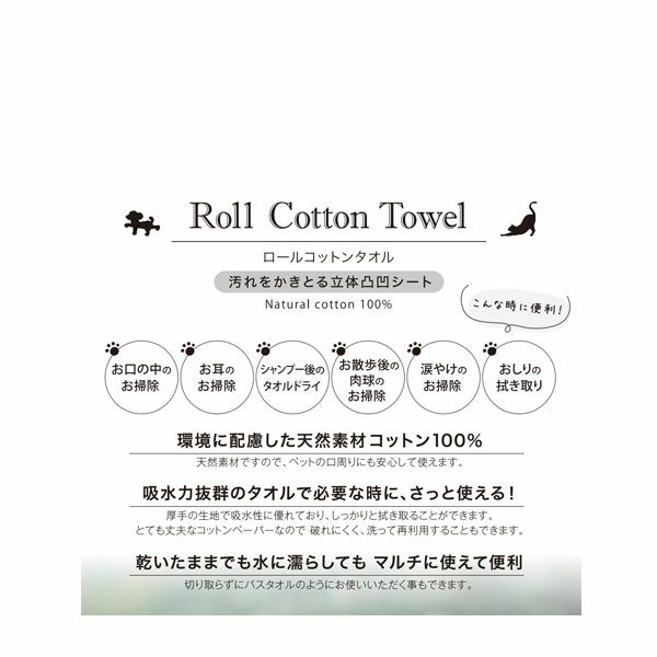 天然素材なのでペットのお口周りにも安心して使え、お散歩後の足拭きなど さまざまなシーンでご使用頂けます。吸収力抜群のタオルで必要な時に、さっと使えます!用途にわけて長さを調節でき、乾いたままでも水に濡らしてもマルチに使えて便利!