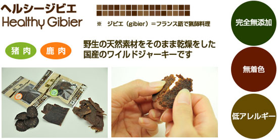 ジビエ(gibier)とはフランス語で猟師料理を指します。ヘルシージビエは野生動物の肉、天然素材をそのまま乾燥をした完全無添加、無着色、低アレルギーの国産ワイルドジャーキー(猪肉・鹿肉) です。
