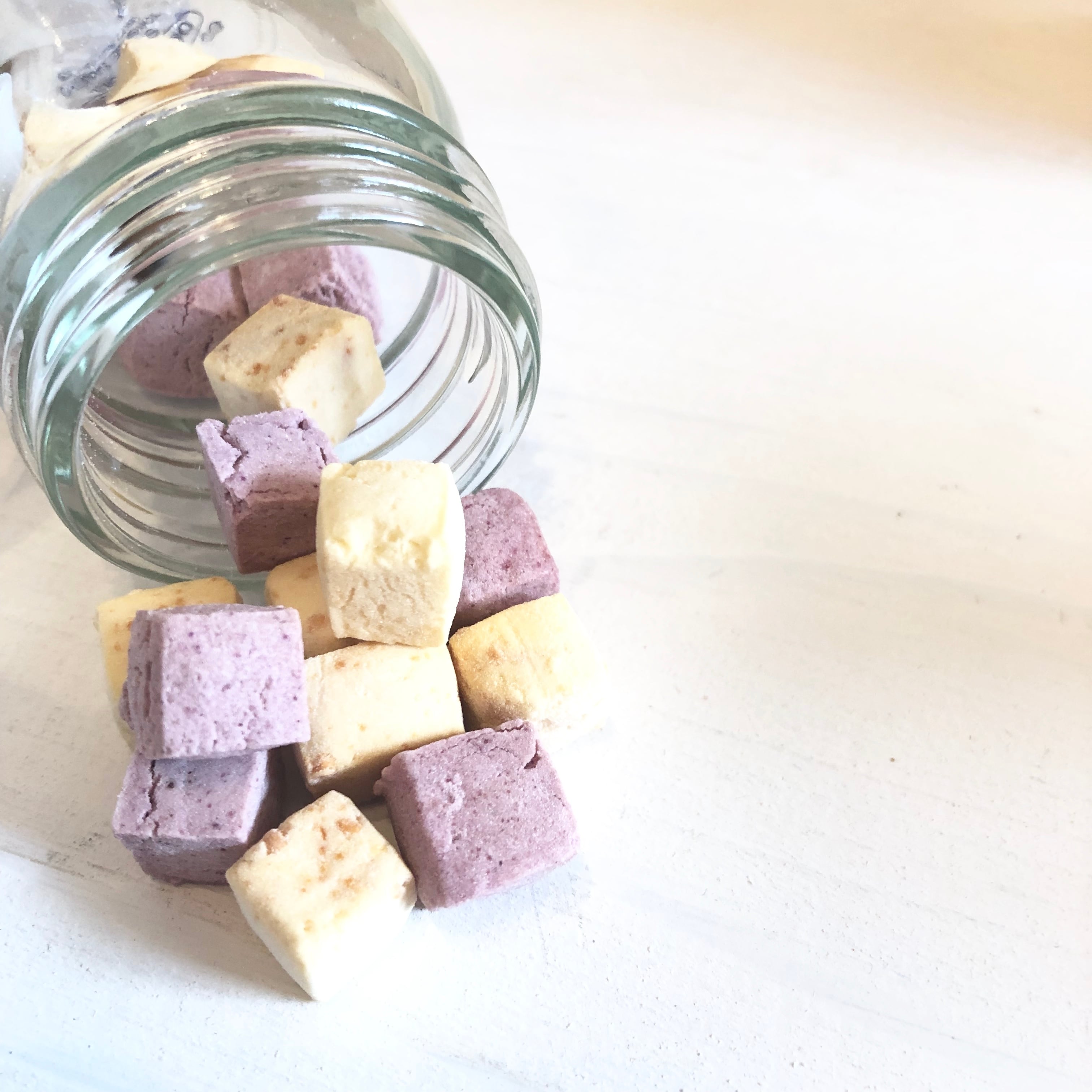 二種類のぷちキューブが入ったミニサイズの瓶のお菓子です。ちーず&紫いものアソートです。