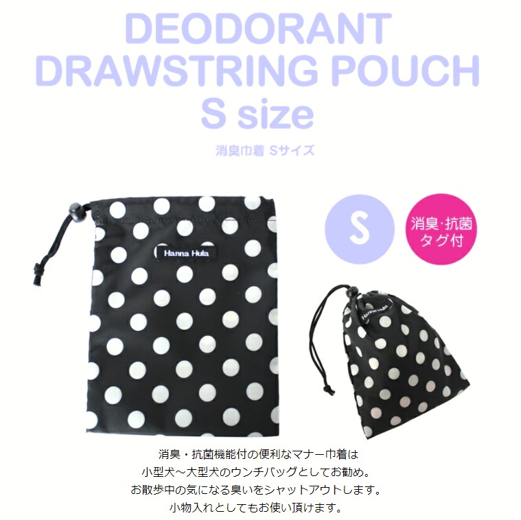 特徴アンモニア臭・酢酸ガス臭・硫化水素ガス臭を除去する消臭糸(消臭効果)と、光をエネルギーとしてニオイの原因となる有機物を分解する光触媒(抗菌効果)加工の『ダブル消臭機能ネームタグ』付きの消臭マナー巾着。消臭・抗菌機能付の便利なマナー巾着はウンチバッグとしてお勧め(中型犬?大型犬は、消臭巾着Mサイズがお勧め)。お散歩中の気になる臭いをシャットアウトします。小物入れとしてもお使い頂けます。大きさ S:縦22cm×横16.5cm素材 ポリエステル