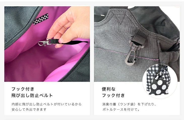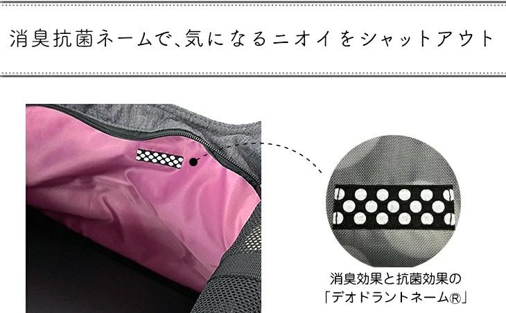 ◆軽量・丈夫な素材で、撥水加工済でお手入れも簡単。◆上部メッシュカバーのダブルファスナーはロック機能で安心。◆飛出し防止フック、底鋲付。◆着脱可能な底板付きで、取り外した底には厚手のウレタンを使用しているこだわり。スリングのような柔らかい風合いが好みの方は、底板を取り外して使用することが可能です。◆ショルダー紐は長さ調整可能です。◆消臭効果と抗菌効果の「デオドラントネーム(R)」付き。◆メッシュ地カバーがついているから、蚊の対策にも。◆メッシュ窓は爪が引っかからない仕様。