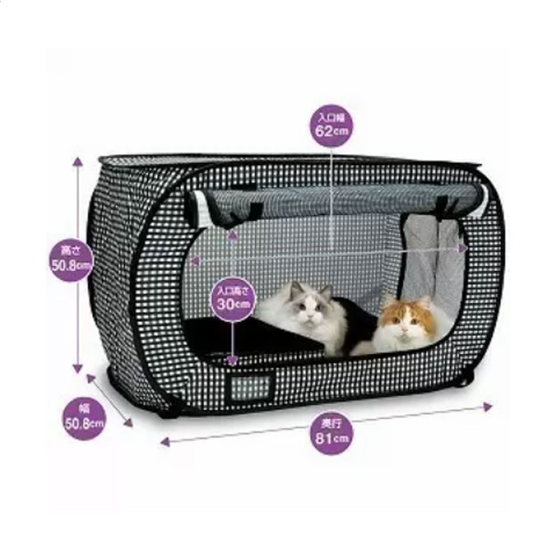 仕様●屋外 緊急時の備えとして(同行避難対応)帰省や引越し等の移動時、庭やベランダで日光浴など。 ●室内 くつろげる個室として来客、工事、掃除等の際の一時的隔離、トイレケージとして、 病気時の安静確保や保護猫等の隔離に。 サイズ 組立時:50.8cmx50.8cmx81cm 折りたたみ時:30cmx30cmx11cm 入口サイズ:正面35cmx35cm 側面 62cmx30cm 重量 1,760g *折りたたみできる商品の特性上、サイズ・重量に多少の個体差がございます 素材 〈布地〉ポリエステル〈芯〉スチール〈メッシュ〉ポリエステル
