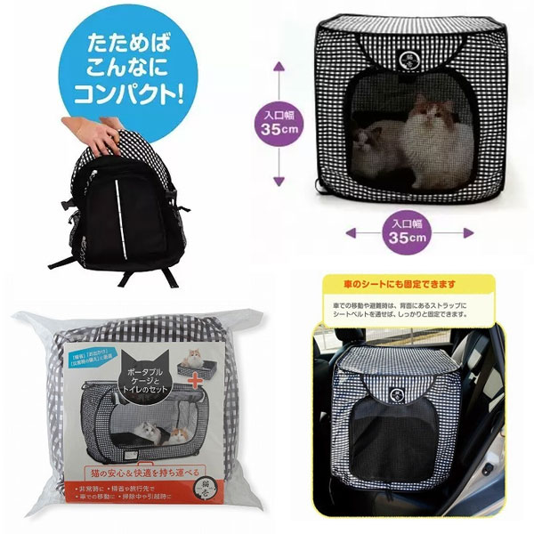 大人気のポータブルシリーズにオトクなセット品が登場! いつもは猫ちゃんたちの憩いの場が、 旅行にも、緊急避難にもという便利で強~い味方 ドライブや週末の旅行、ちょっと長い帰省のとき、 いざ台風や地震などの災害で避難するときも。 どんなときも、いつだってかわいい猫ちゃんと一緒に過ごしたい! そんな愛猫家の想いに応えてくれるのがこの「ポータブル ケージ」。 普段は猫ちゃんたちのくつろぐお気に入りの個室、 出かけるときにはそのまま車に乗せるだけ。 もちろんコンパクトに折りたたんで運ぶこともできます。 いつでも、どんな場所でも猫の快適スペースに早変わり! ポータブルケージとトイレのセットのここがスゴイ! ●仔猫なら3~4匹。大人の猫でも2匹は余裕で過ごせるゆったりサイズ。 ●小さく折りたたんで収納できます。 ●車のシートにシートベルトで固定できます。 ●フリースマットとケージ、キャリー、トイレをまとめて入れられる収納袋付き(ケージにのみ付属) ●水洗いできます。 ●上部に表札付き。猫ちゃんの名前や住所氏名を記入できる表札もついているので、緊急避難先などで、少し目を離したすきにケージがどこかに動かされていても探すことができます。 ●さまざまな場面でお使いいただけるため一揃い用意しておくと安心です。 たたみ方は、下の動画にて、ご覧になれます。
