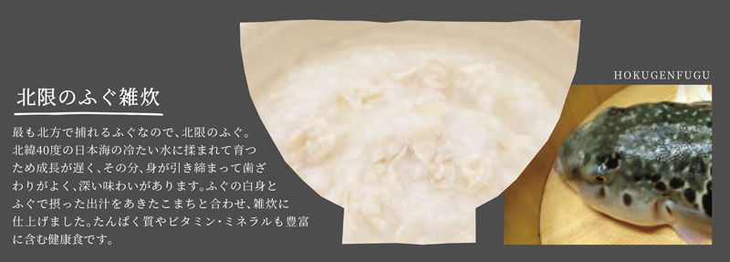 【原材料】 水、米(あきたこまち)、ふぐの身(まふぐ・ごまふぐ・しょうさいふぐ)、ふぐ出汁