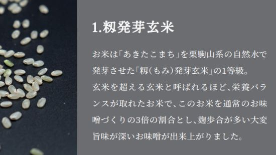 超低塩玄米味噌【こまくら】は創業安政二年 天然醸造仕込「石孫本店」のお味噌です。【味噌づくりの醸造の要は「麹」にあります】「石孫本店」のお味噌づくりは100年以上使い続けている木桶に蔵付き酵母(いしまご恵比寿酵母)が住みついており、その酵母による「麹蓋での麹づくり」、「木桶による熟成」を行っている全国でも希少な蔵元です。「昔ながらの味噌醤油屋の風情」を後世に残すお味噌を造っています。【こだわりの原料は、全て秋田県産 】