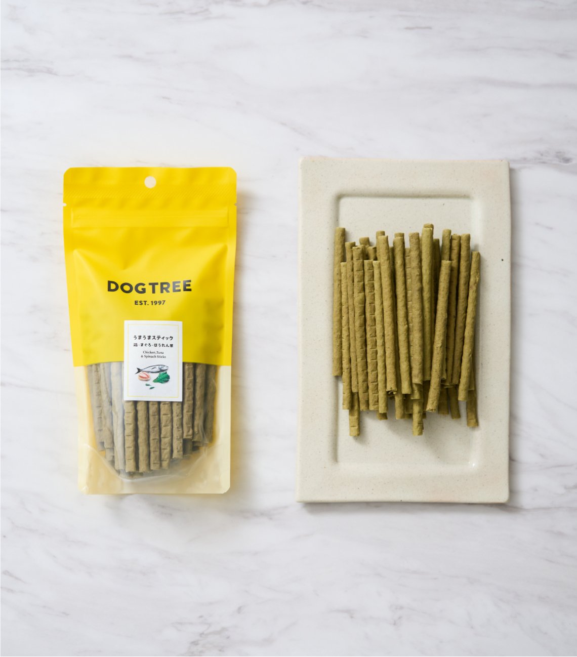 鶏肉と、カルシウム、ビタミン、DHA豊富な鮪と、鉄分豊富なほうれん草をブレンドした低カロリーなソフトスティックです。