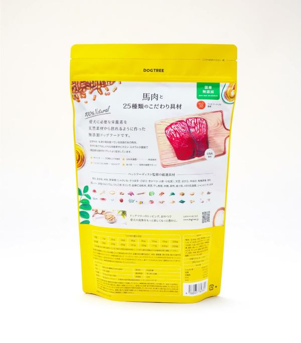 主成分は、私達が普段食べている品質の生の馬肉。関節の健康をサポートする緑イ貝、免疫維持のABM乳酸菌、90種以上の栄養素を含むモリンガ、お口のケアにシャンピニオン粉末など、さまざまな栄養素を含む多彩な食材を使用。素材に合った下ごしらえをした後に低温でじっくり調理した、 食材本来の旨みと栄養素が摂れるドッグフードです。