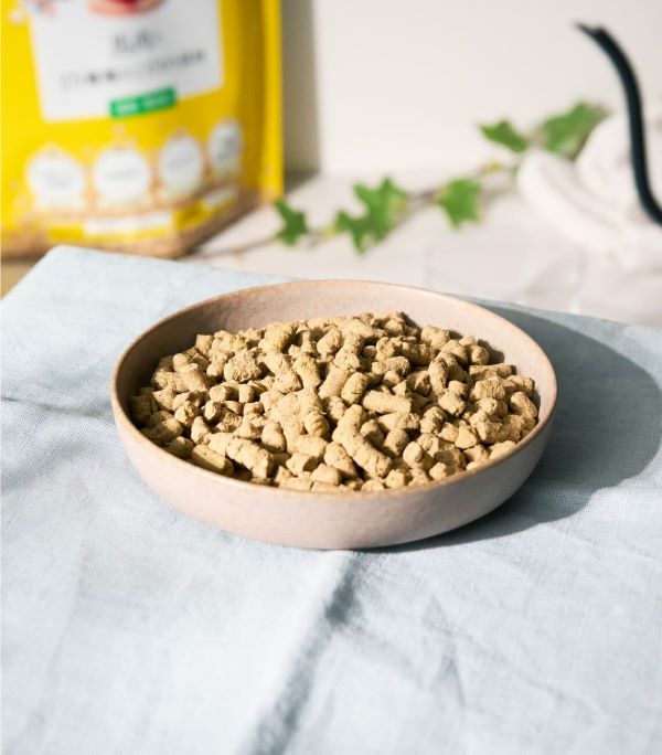 良質で吸収されやすいタンパク質が豊富な生肉や大豆をはじめ、野菜、豚レバー、有機黒糖、卵殻カルシウム、りんご皮など栄養豊富で高品質な食材をバランスよく配合しています。